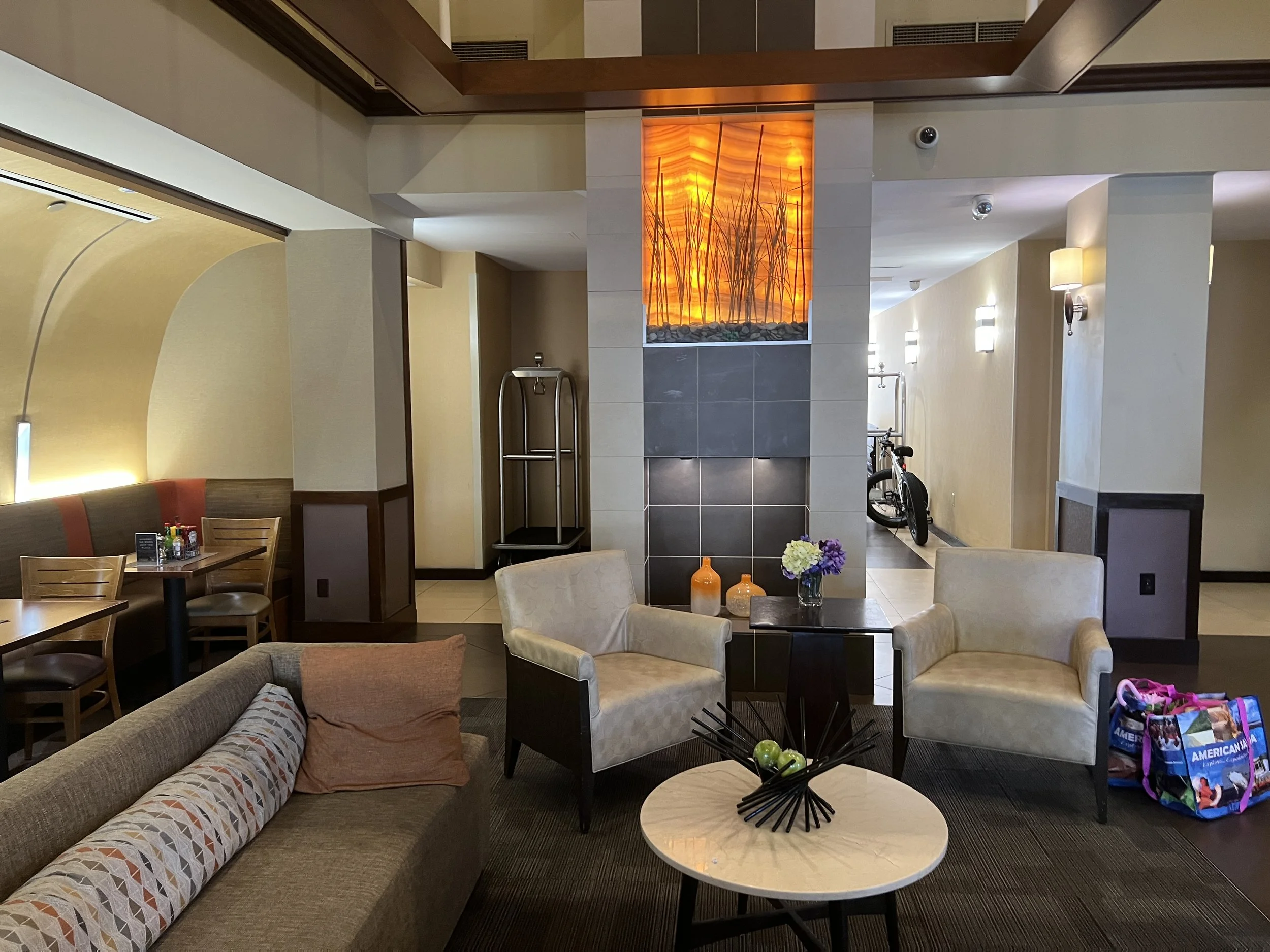 The lobby of the hotel was smaller than I expected. The hotel looks a little worn down but not too badly. I used the app to checkin so I skipped the line at the front desk. There is a business center in the lobby but during my stay, there was no working printer. Have a backup plan if you need to print or re-print luggage tags.