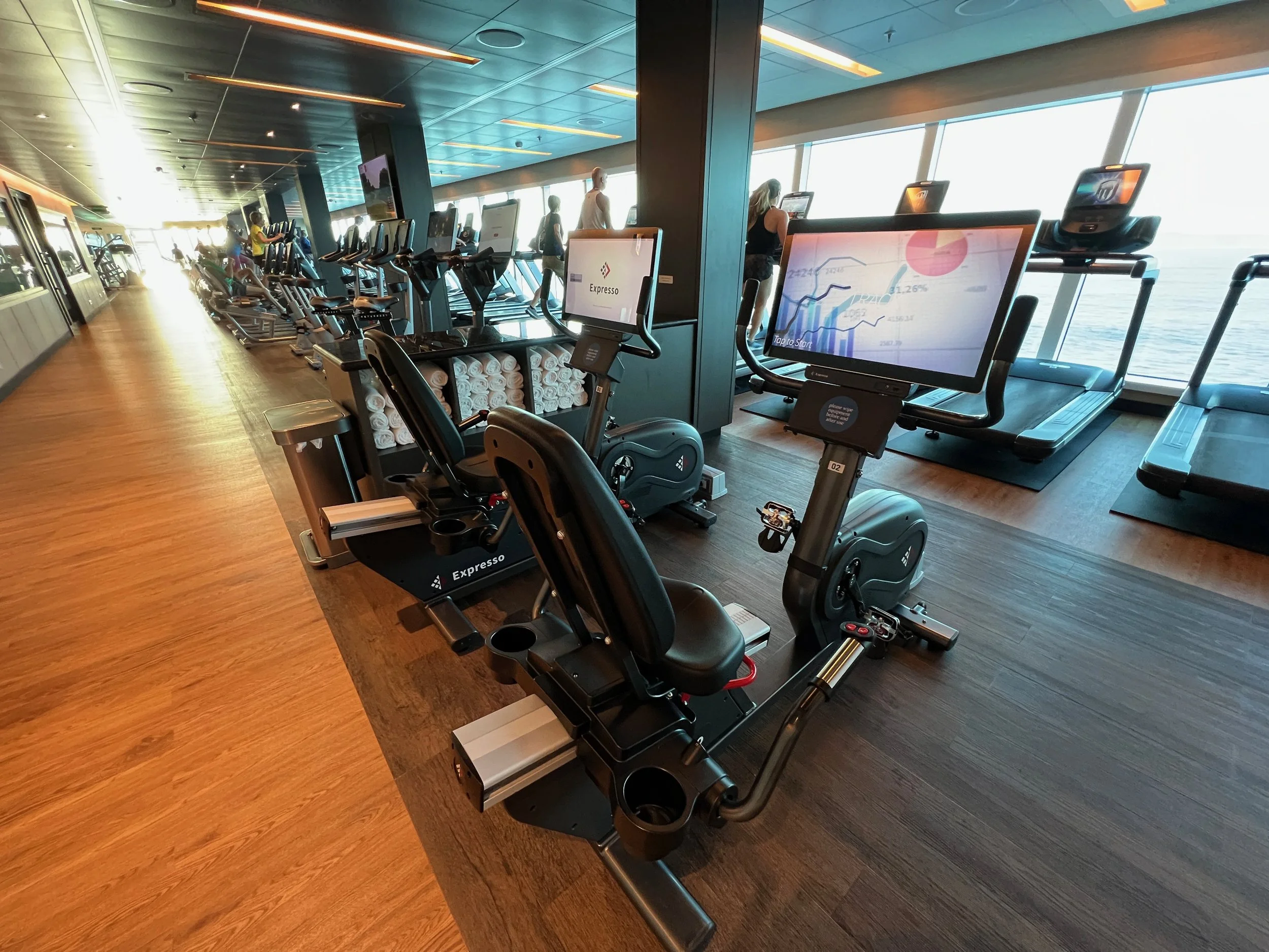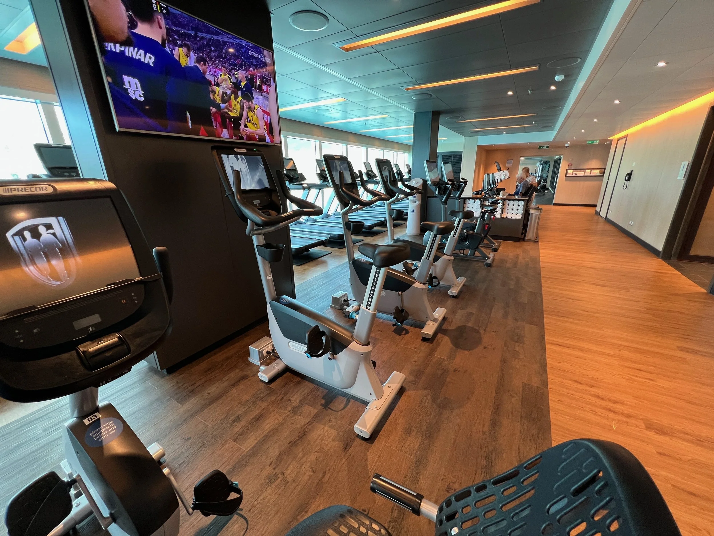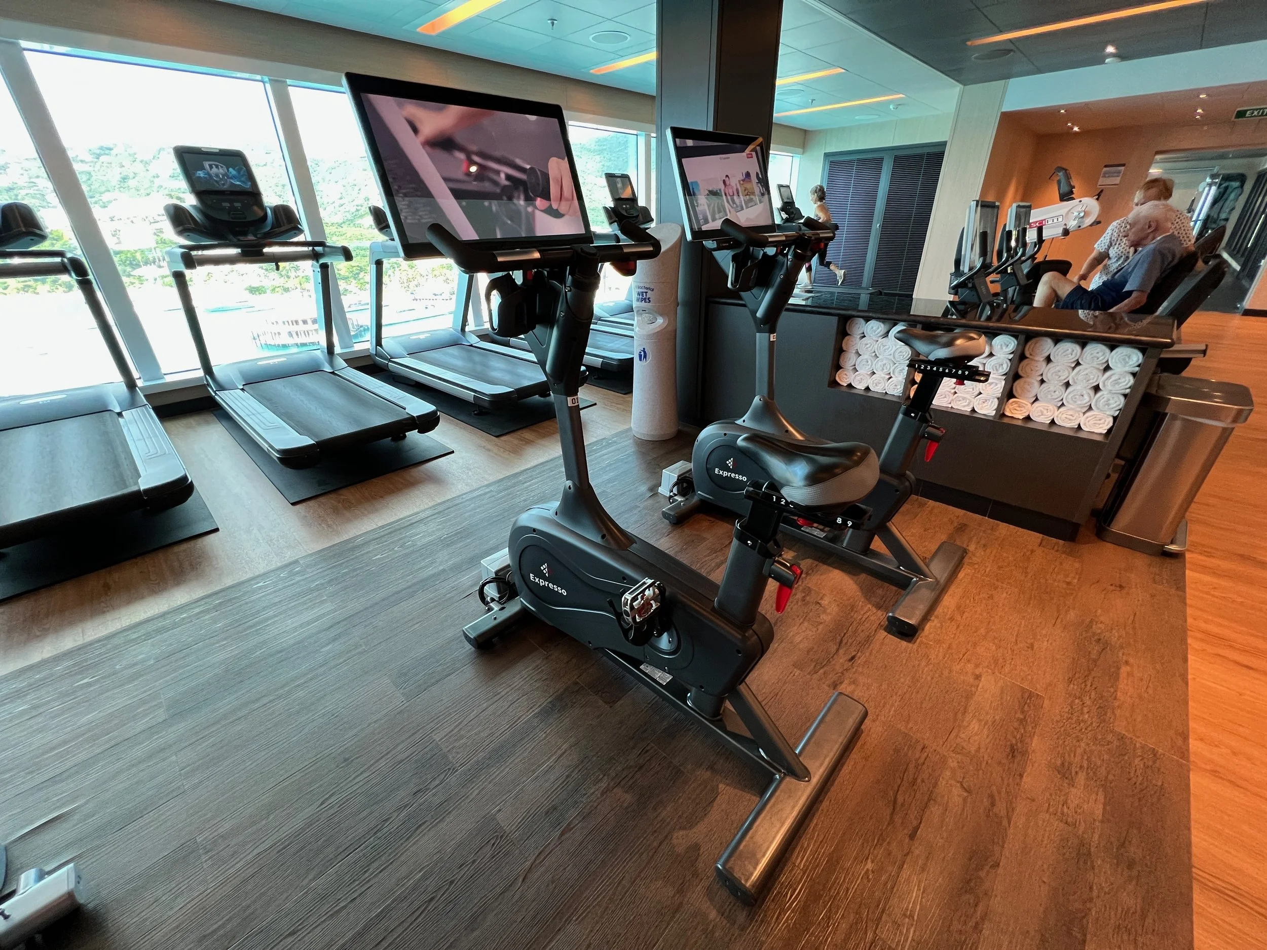 Wiping down the machine is particularly important on a ship. Not everyone is careful about washing their hands, so take precautions. I recommend you wipe down the machine or equipment before and after you use it. The last person may have forgotten to wipe it down after they were done. The gym will have either disinfectant wipe cloths, or they will have paper towels and a spray bottle with disinfectant in it. I recommend you wipe down the equipment and then use a clean hand towel, usually available in the gym, to wipe it down.