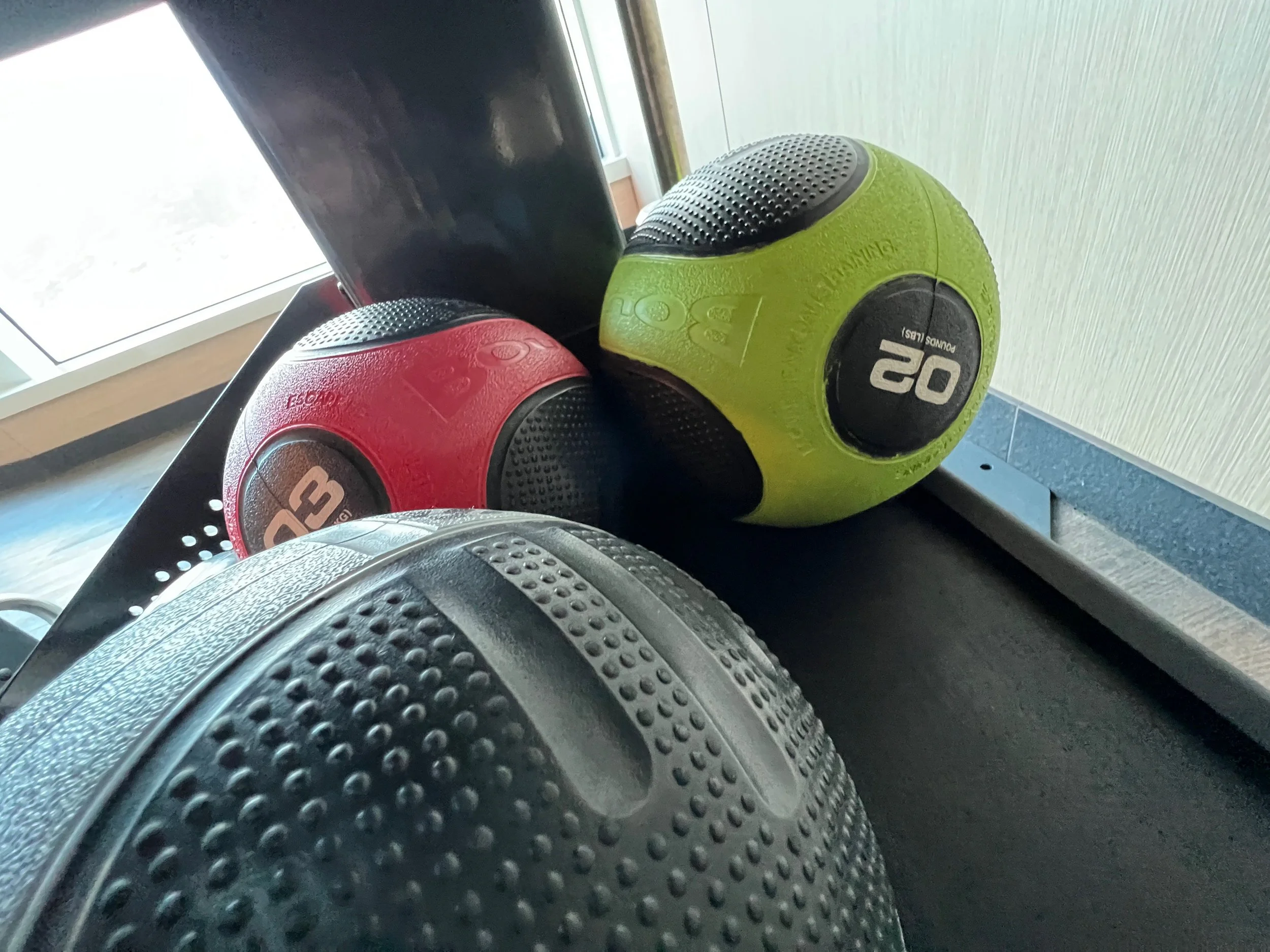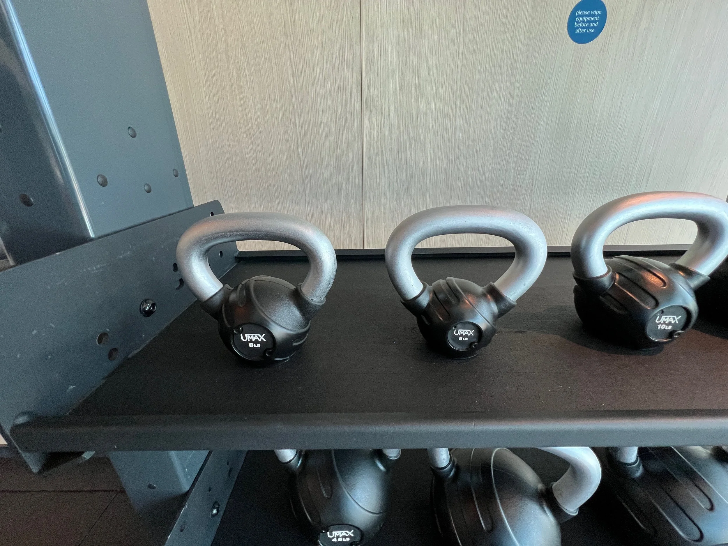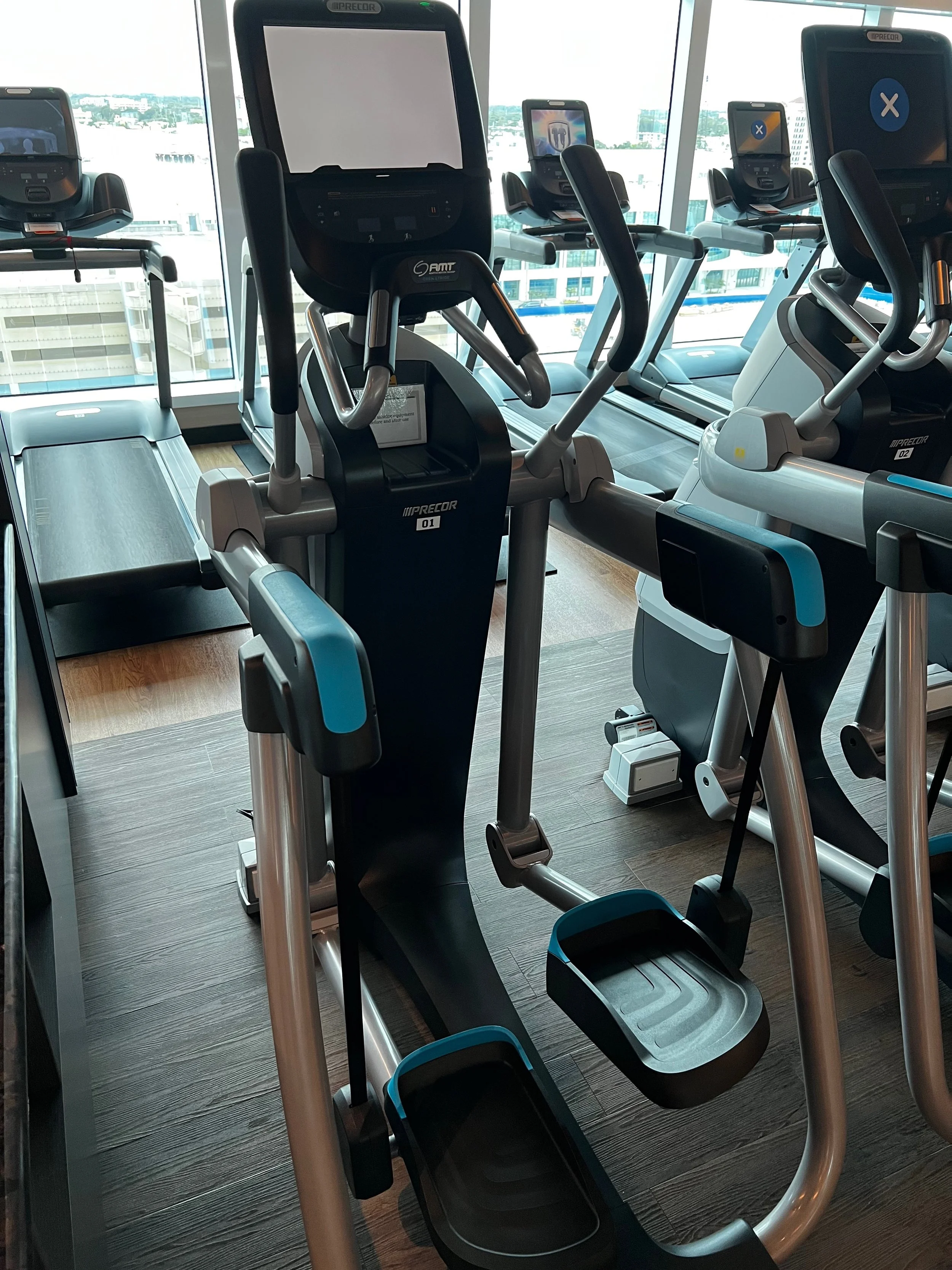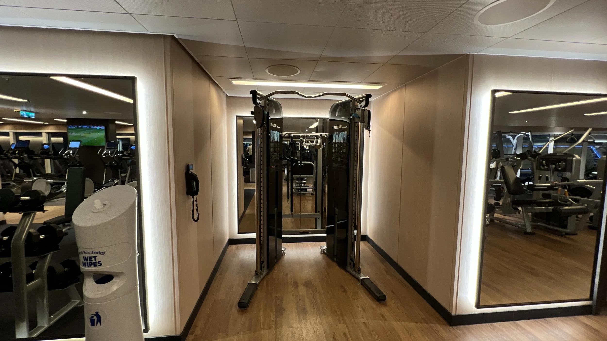 Wiping down the machine is particularly important on a ship. Not everyone is careful about washing their hands, so take precautions. I recommend you wipe down the machine or equipment before and after you use it. The last person may have forgotten to wipe it down after they were done. The gym will have either disinfectant wipe cloths, or they will have paper towels and a spray bottle with disinfectant in it. I recommend you wipe down the equipment and then use a clean hand towel, usually available in the gym, to wipe it down.