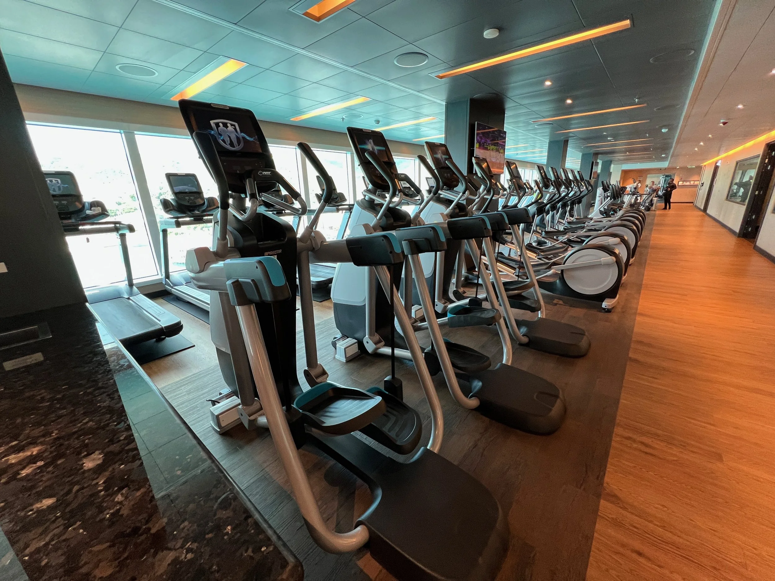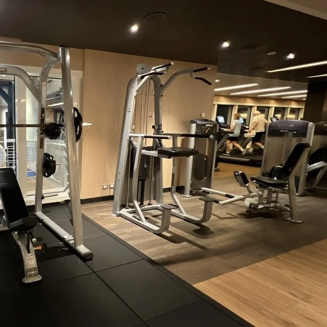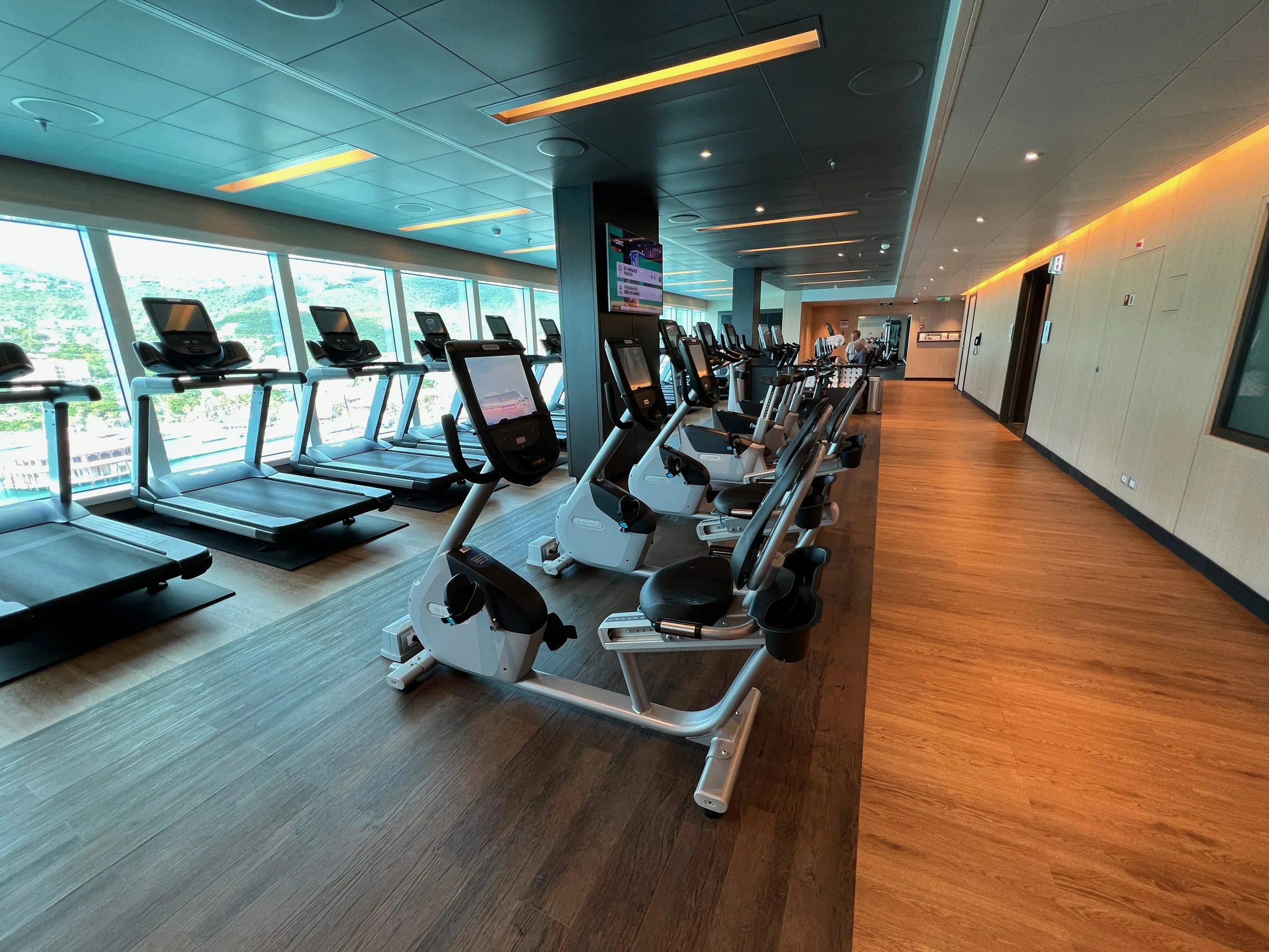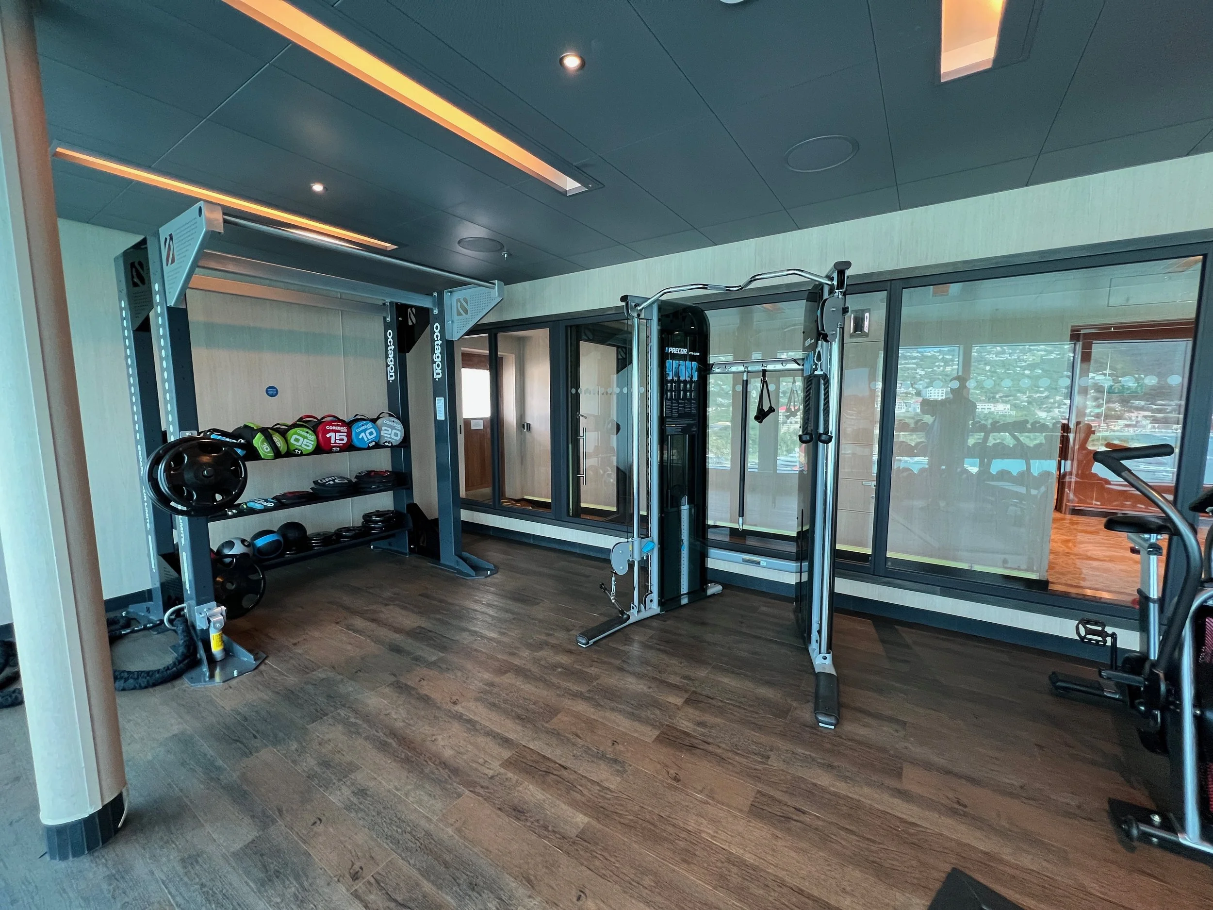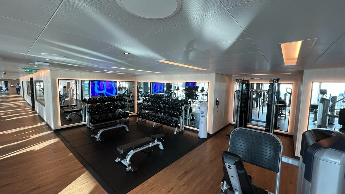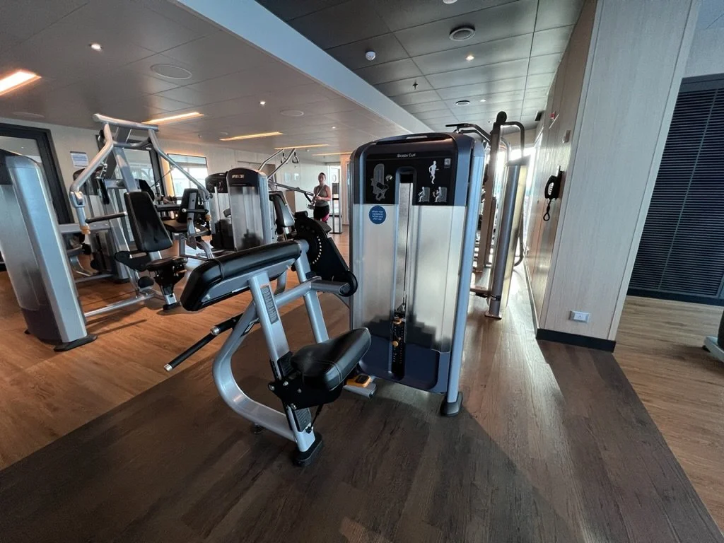 On Sky Princess the Fitness Center is located on Deck 17 aft starboard side, right next to the smoking area (ugg). The placement follows the trend in newer ships of placing the Fitness Center in an out of the way area (Virgin Voyages ships being the exception to the rule, as you would expect). Traditionally you would find the Fitness Center on a high deck overlooking the bow. But this is prime real estate, so now you find that area is used for revenue generating venues such as premium lounges.