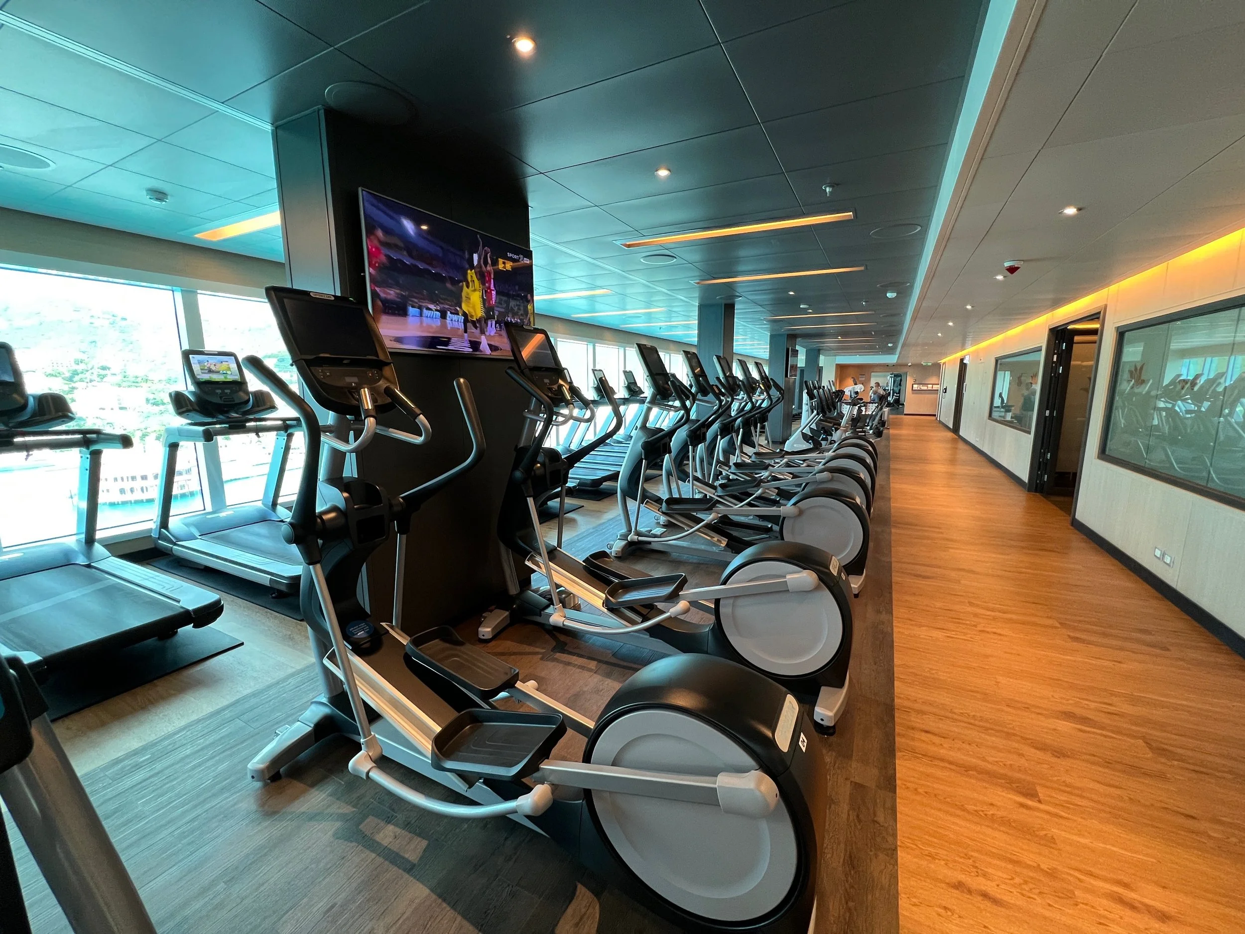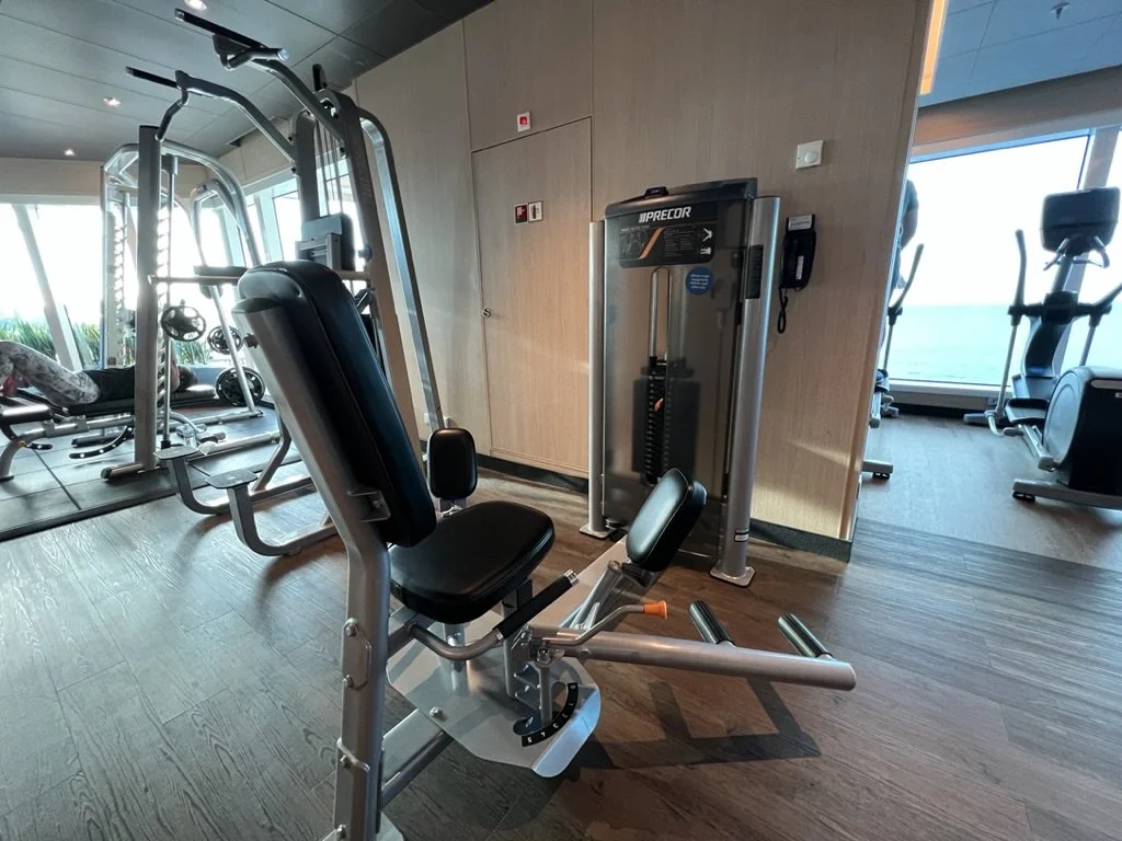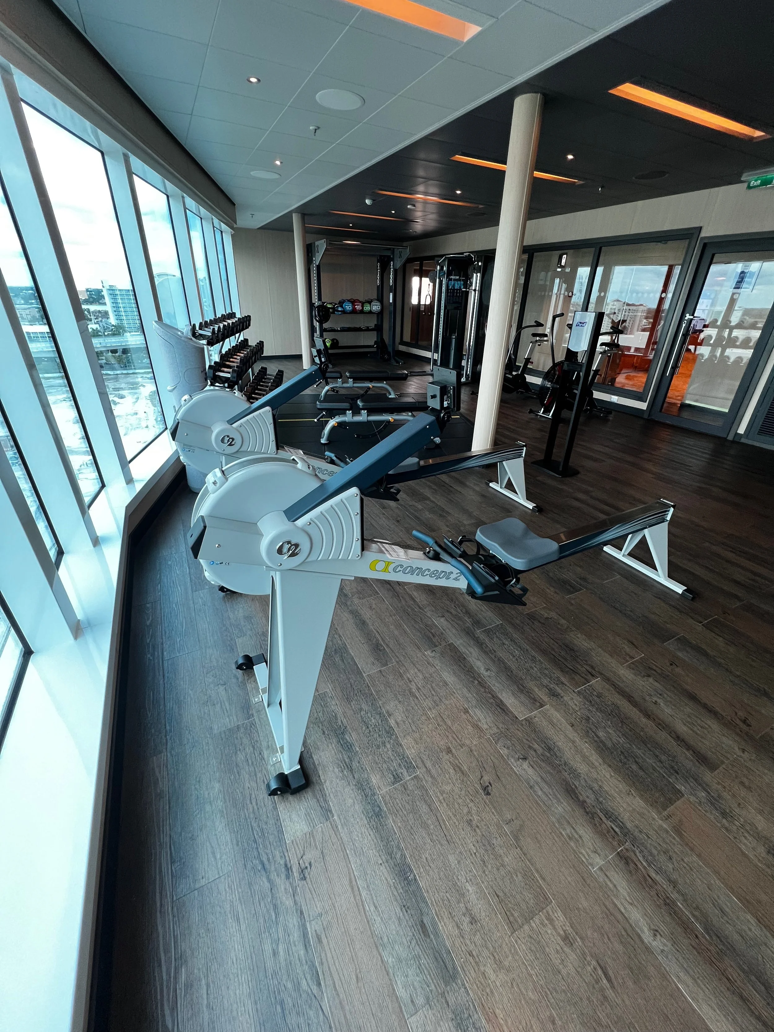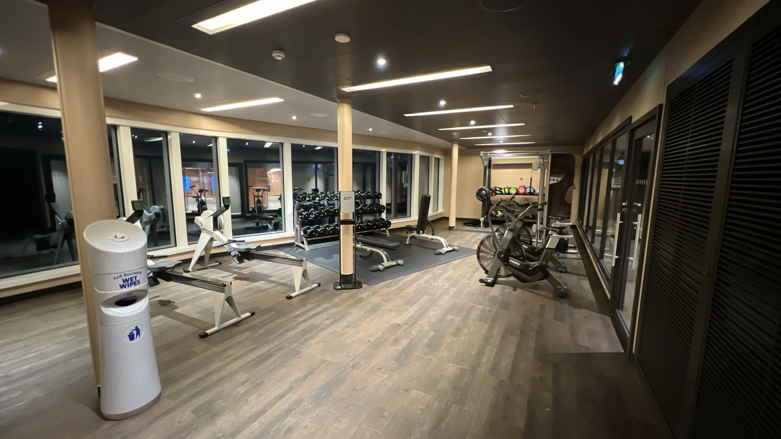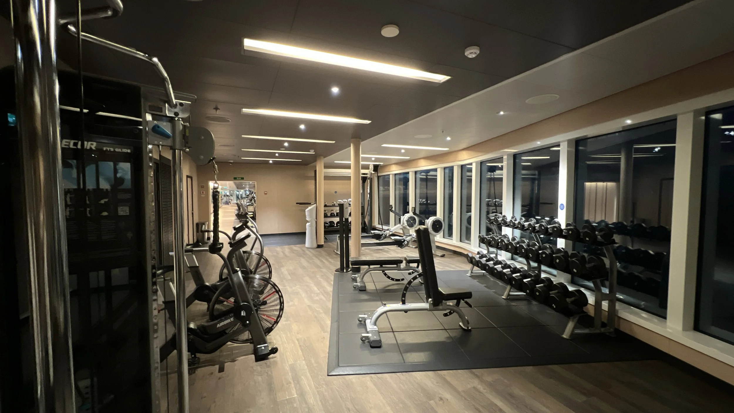 On Sky Princess the Fitness Center is located on Deck 17 aft starboard side, right next to the smoking area (ugg). The placement follows the trend in newer ships of placing the Fitness Center in an out of the way area (Virgin Voyages ships being the exception to the rule, as you would expect). Traditionally you would find the Fitness Center on a high deck overlooking the bow. But this is prime real estate, so now you find that area is used for revenue generating venues such as premium lounges.