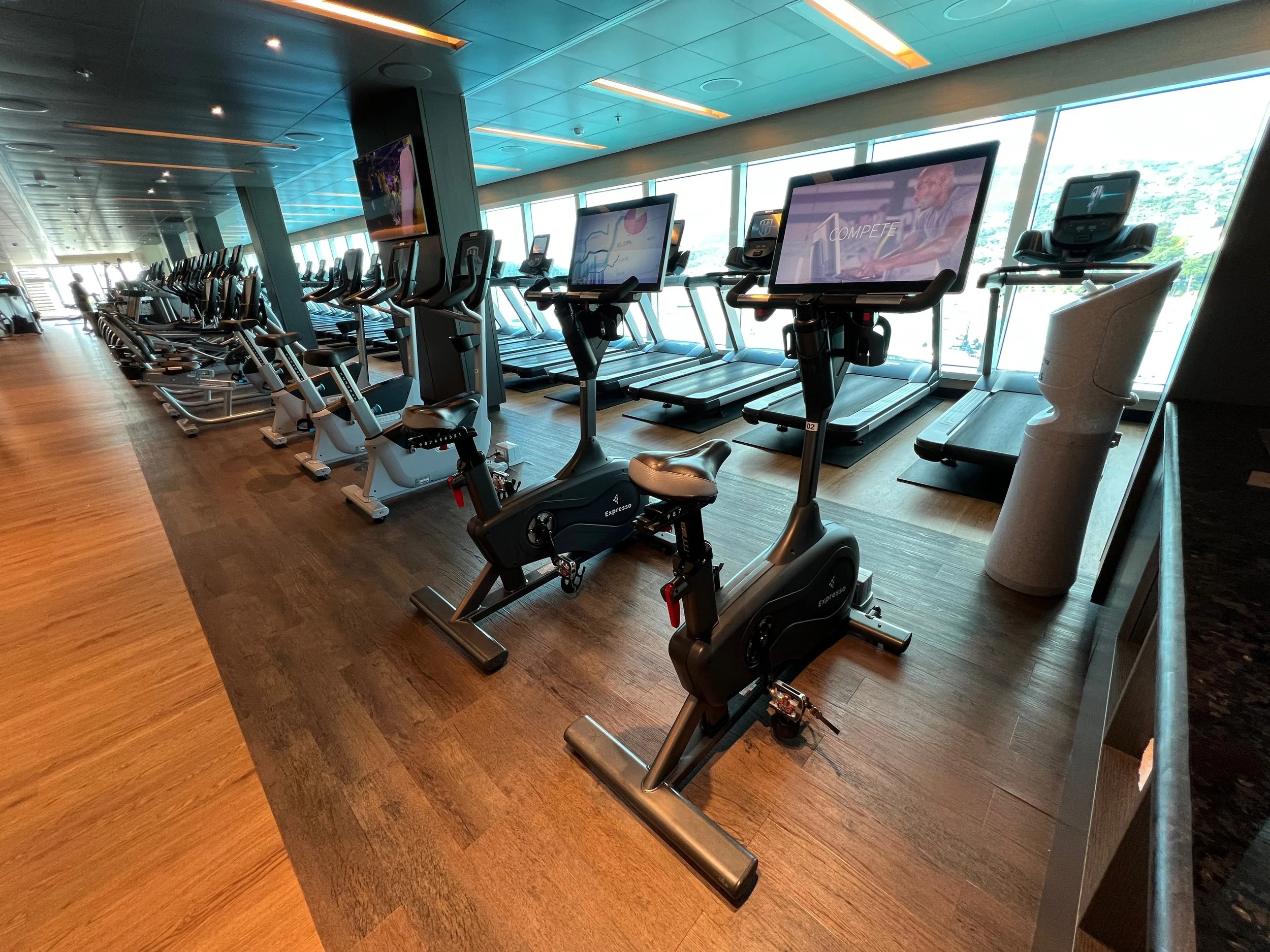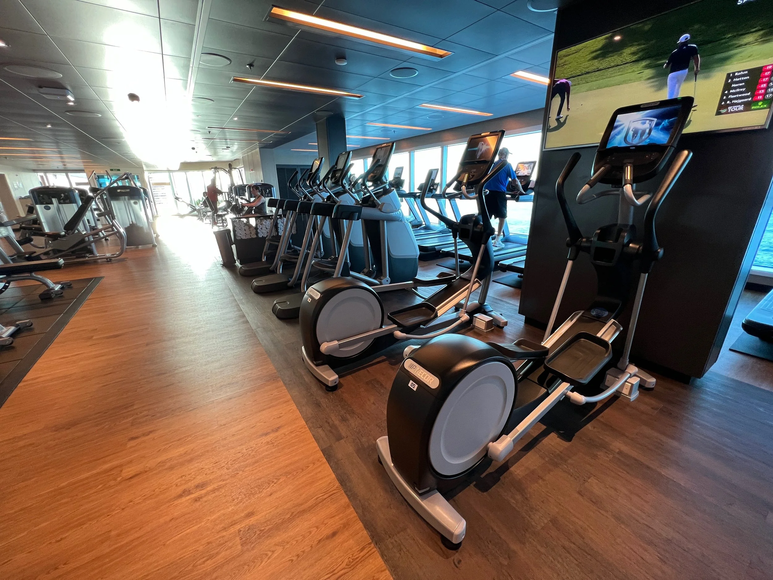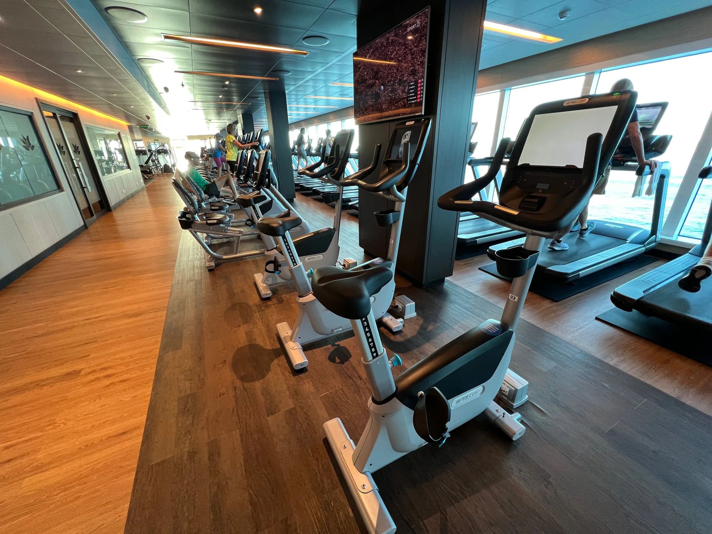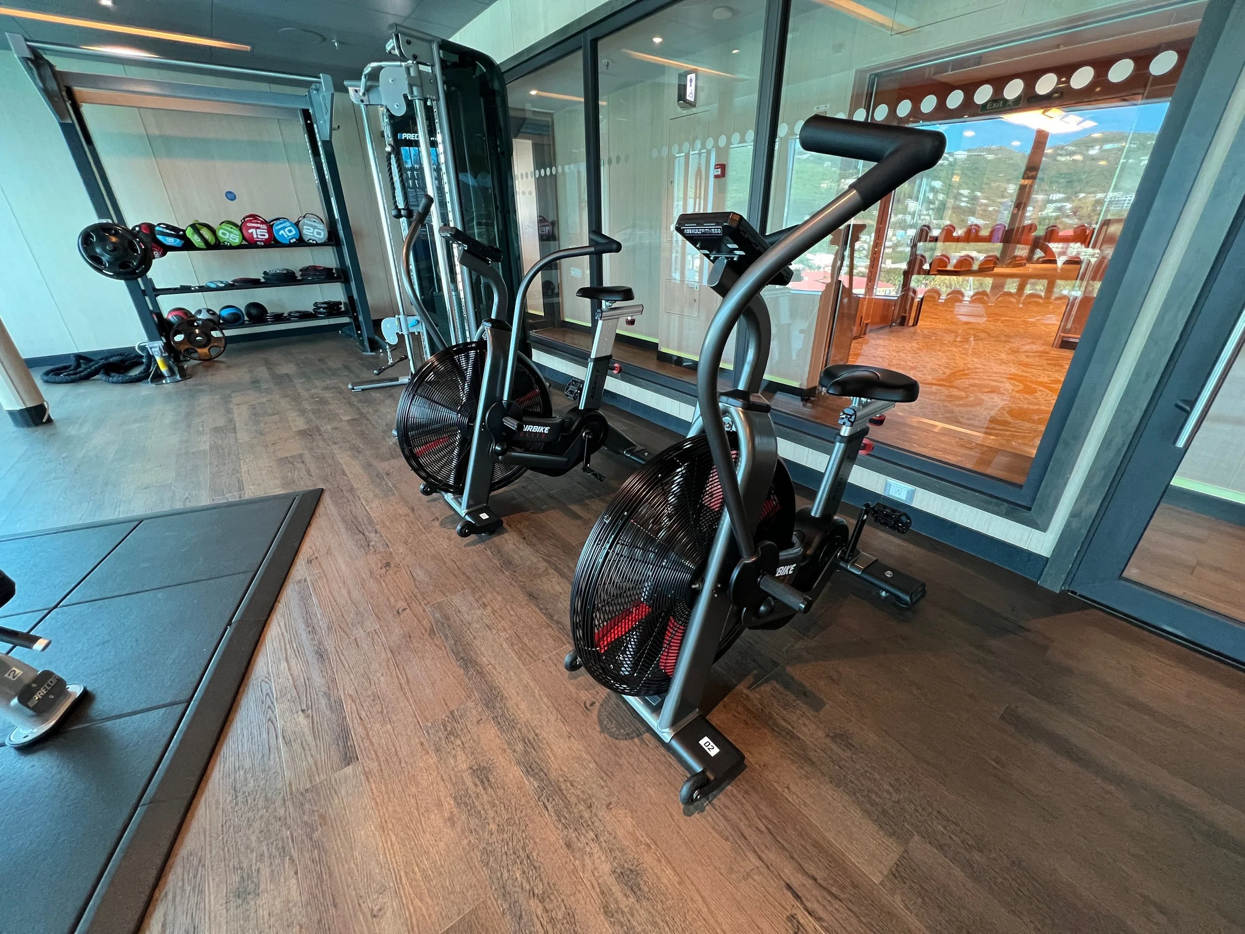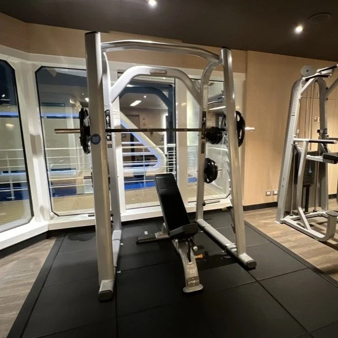 On Sky Princess the Fitness Center is located on Deck 17 aft starboard side, right next to the smoking area (ugg). The placement follows the trend in newer ships of placing the Fitness Center in an out of the way area (Virgin Voyages ships being the exception to the rule, as you would expect). Traditionally you would find the Fitness Center on a high deck overlooking the bow. But this is prime real estate, so now you find that area is used for revenue generating venues such as premium lounges.