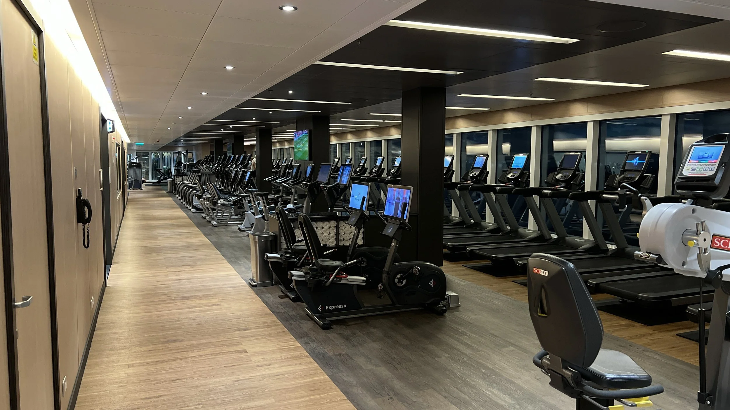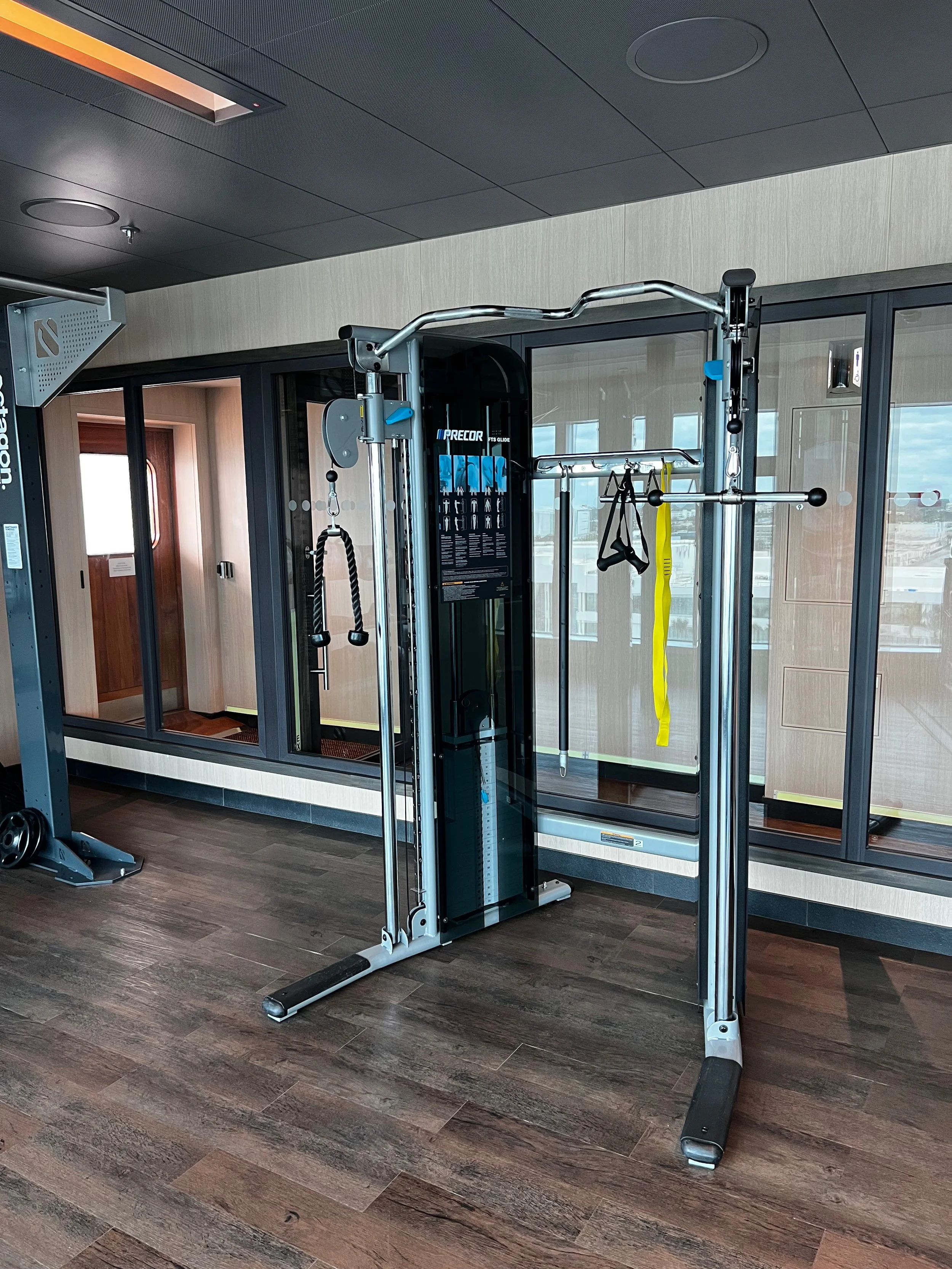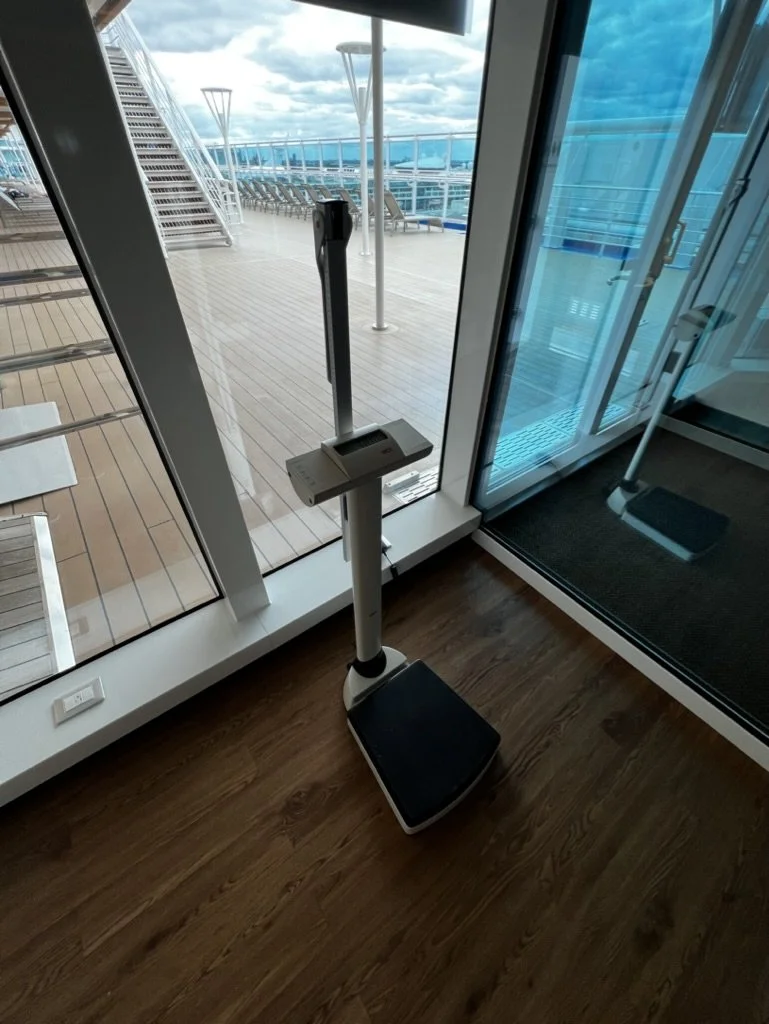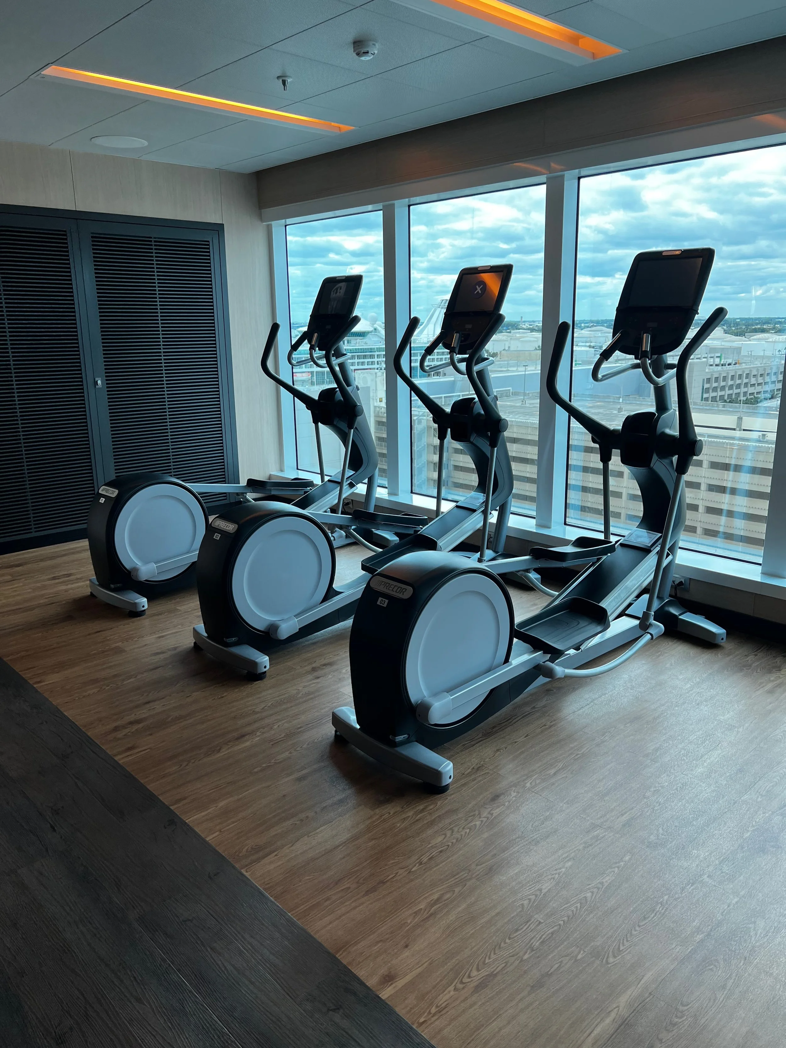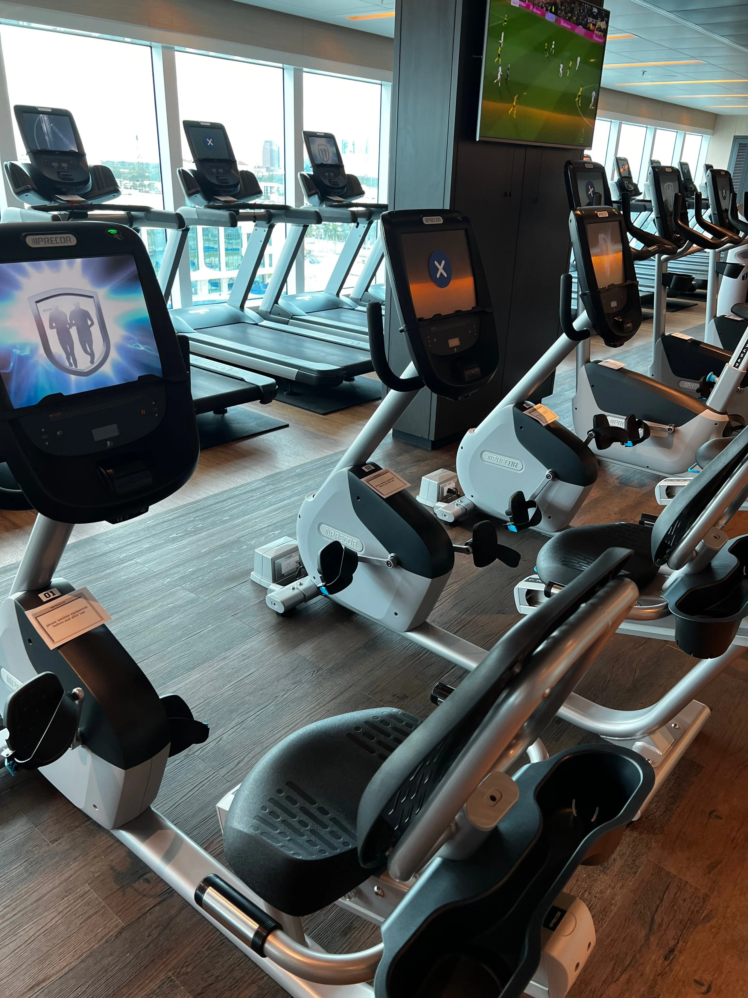 On Sky Princess the Fitness Center is located on Deck 17 aft starboard side, right next to the smoking area (ugg). The placement follows the trend in newer ships of placing the Fitness Center in an out of the way area (Virgin Voyages ships being the exception to the rule, as you would expect). Traditionally you would find the Fitness Center on a high deck overlooking the bow. But this is prime real estate, so now you find that area is used for revenue generating venues such as premium lounges.